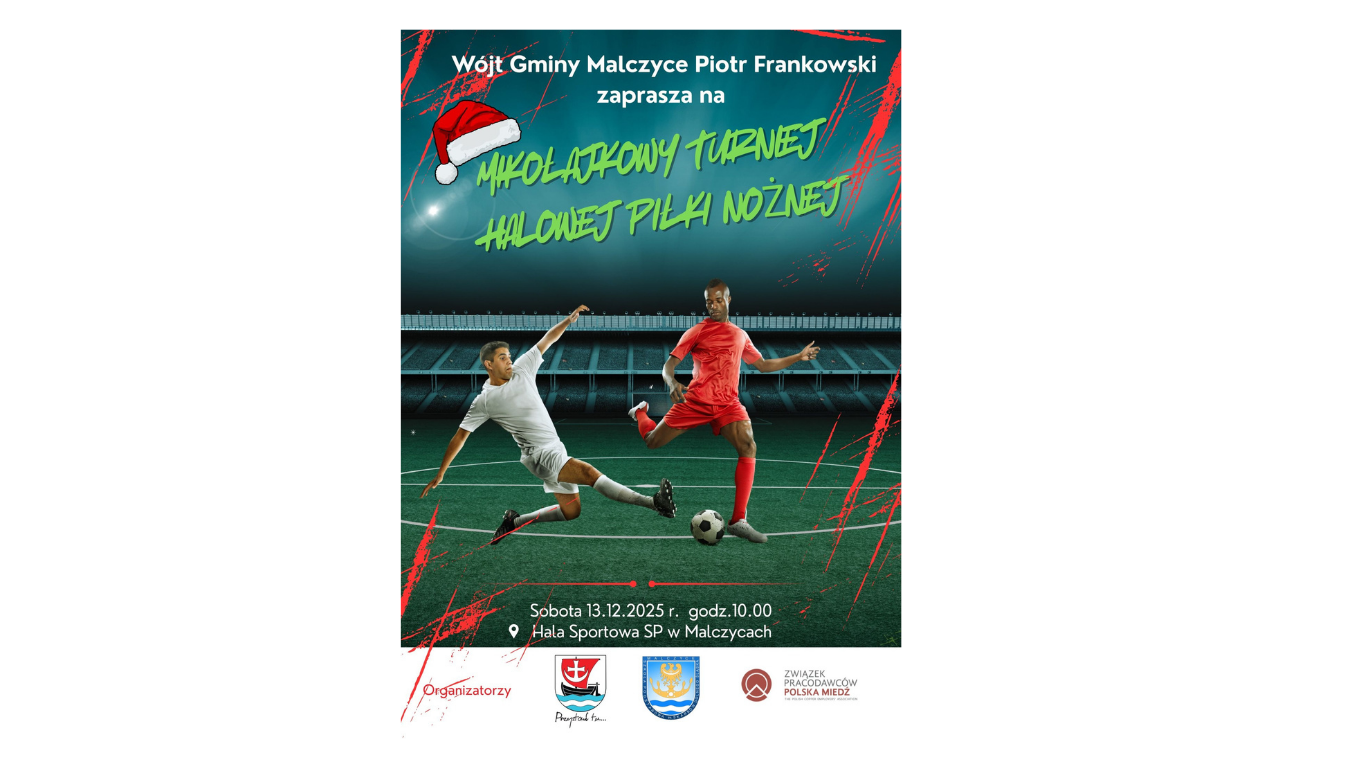 Wójt Gminy Malczyce Piotr Frankowski oraz nauczyciele w-f w SP im. Skarbów Dolnego Śląska zapraszają na Mikołajkowy Turniej Halowej Piłki Nożnej.13.12.2025 r. o godz. 10.00 w Hali Sportowej w Malczycach 10 drużyn powalczy o Puchar Wójta Gminy. decyduje kolejność zgłoszeń czas gry ok. 10 min. roczniki do 2012 ( turniej seniorów 2012 i starsi) drużyny 4+1 (max. 10 osób w […]