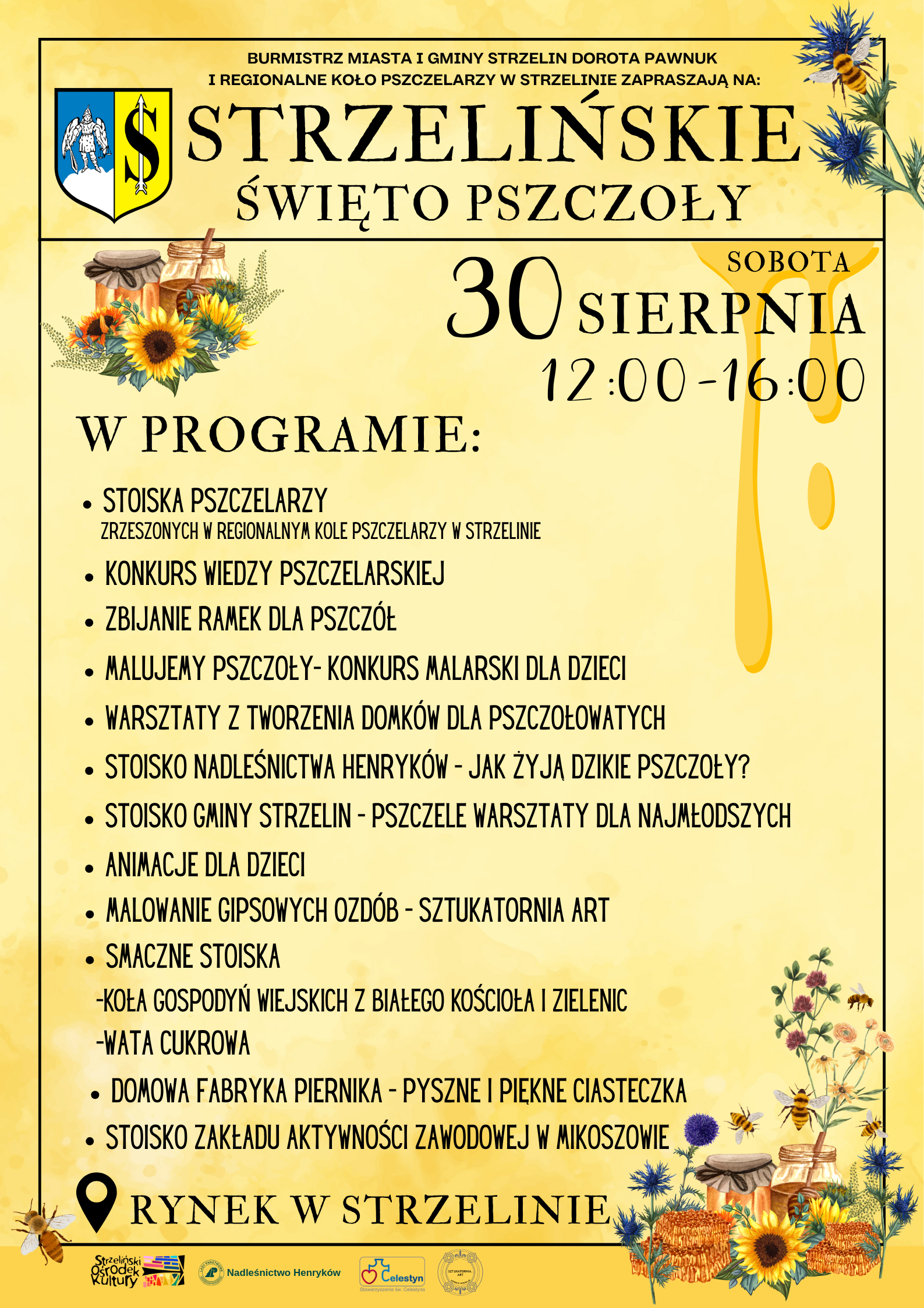 Podajemy szczegóły Strzelińskiego Święta Pszczoły! Rynek w Strzelinie, 30 sierpnia w godzinach: 12:00-16:00 Przede wszystkim zachęcamy do zapoznania się z ofertą pszczelarzy zrzeszonych w Regionalnym Kole Pszczelarzy w Strzelinie odbędą się liczne warsztaty dla dużych i małych: zbijanie ramek dla pszczół, tworzenie domków dla pszczołowatych, malowanie gipsowych kwiatków i pszczółek ze Sztukatornia.art , liczne zagadki […]
