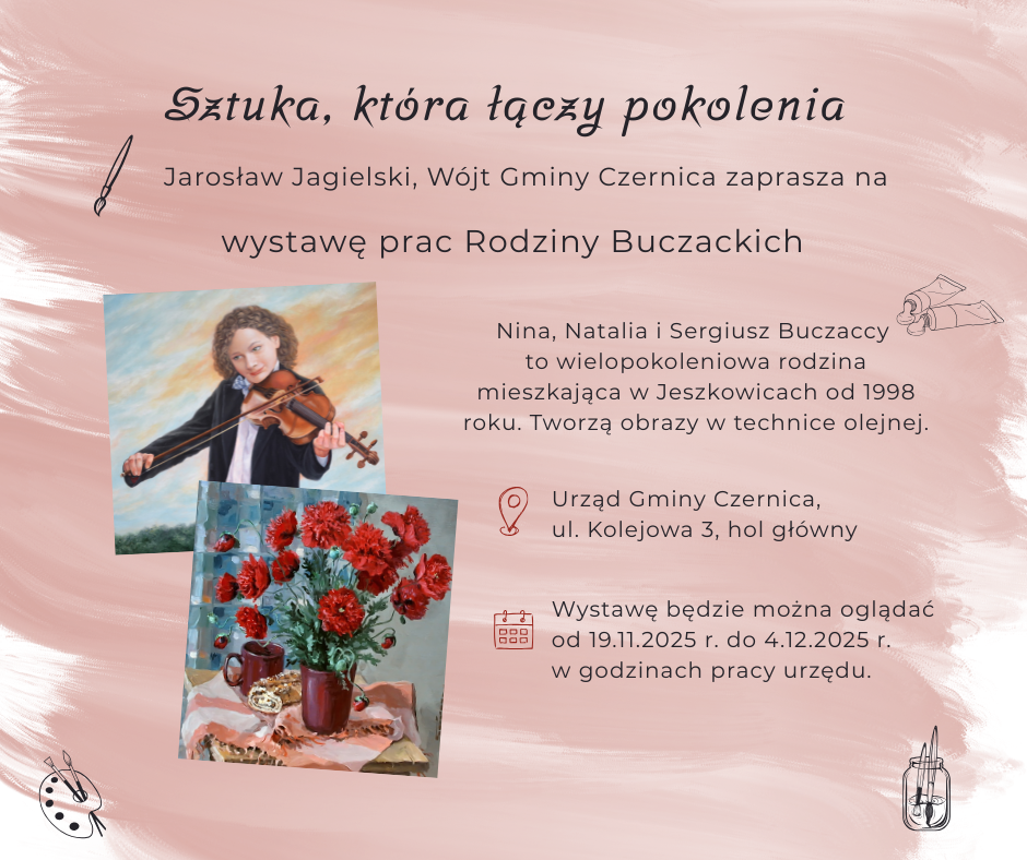Urząd Gminy Czernica Kolejowa 3, CzernicaJarosław Jagielski, Wójt Gminy Czernica zaprasza na wystawę, w której można zanurzyć się w świecie pełnym barw, emocji i niezwykłej precyzji. Prace są różnorodne jak sama sztuka – portrety, pejzaże, obrazy sakralne oraz martwa natura, każde z nich dopracowane z ogromną dbałością o detal i imponującym realizmem. Autorami dzieł są Sergiusz, Nina i Natalia Buczaccy, […]