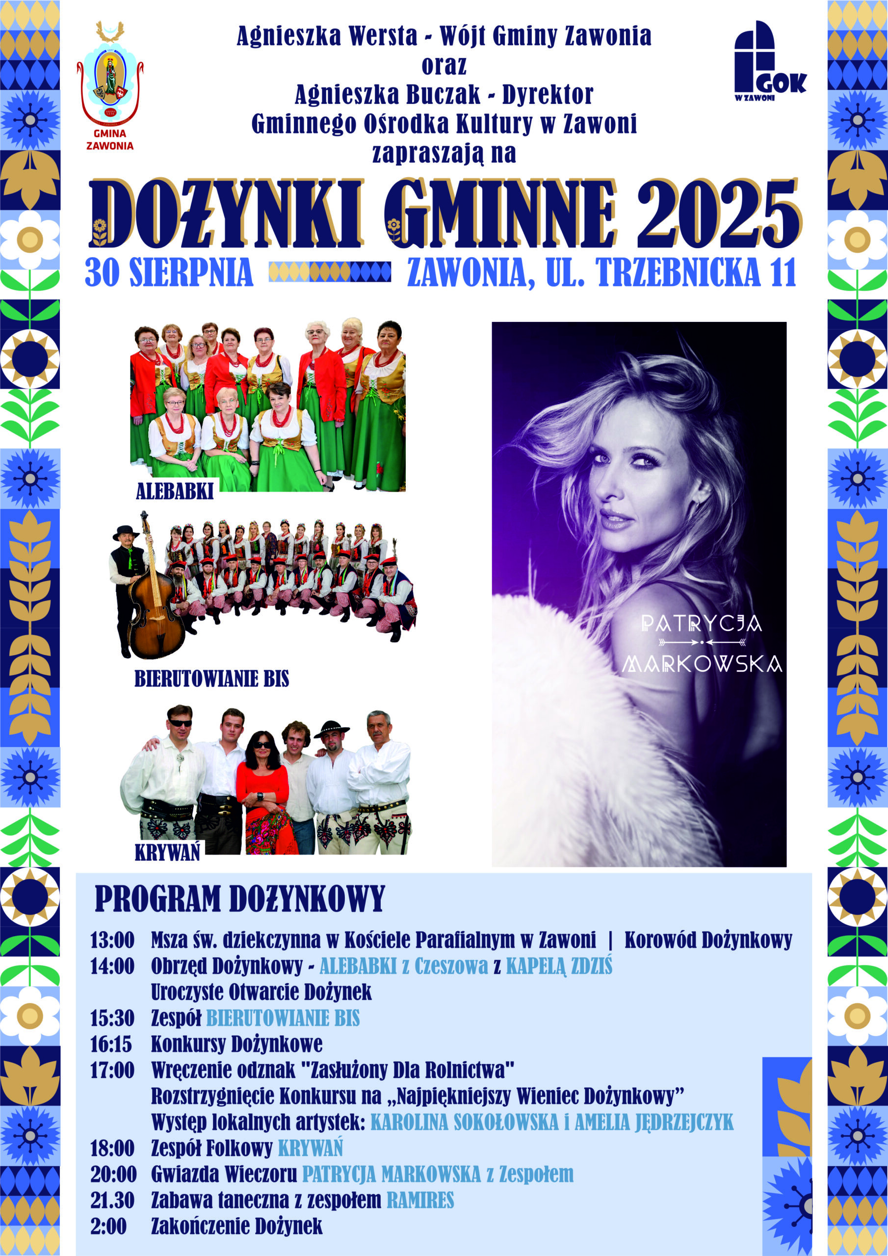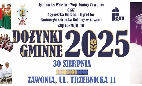 Agnieszka Wersta – Wójt Gminy Zawonia wraz z Gminnym Ośrodkiem Kultury serdecznie zapraszają na wyjątkowe, pełne tradycji i radości święto całej społeczności – Gminne Dożynki w Zawoni, które odbędą się w sobotę, 30 sierpnia 2025 roku!