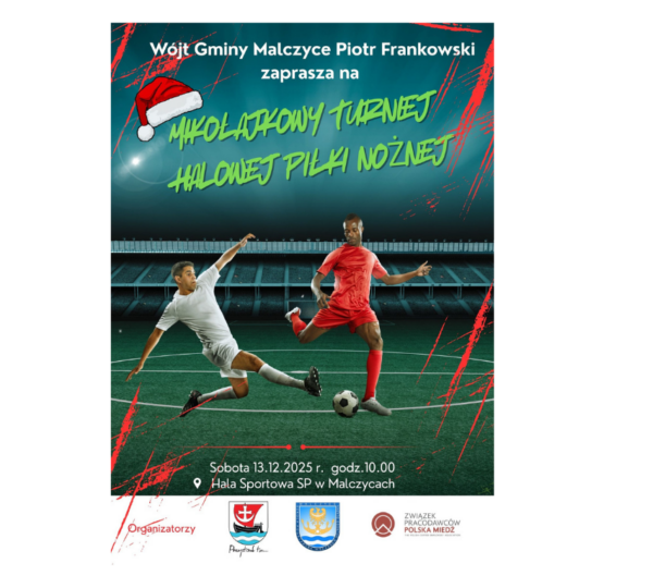 Wójt Gminy Malczyce Piotr Frankowski oraz nauczyciele w-f w SP im. Skarbów Dolnego Śląska zapraszają na 🎅 Mikołajkowy Turniej Halowej Piłki Nożnej.